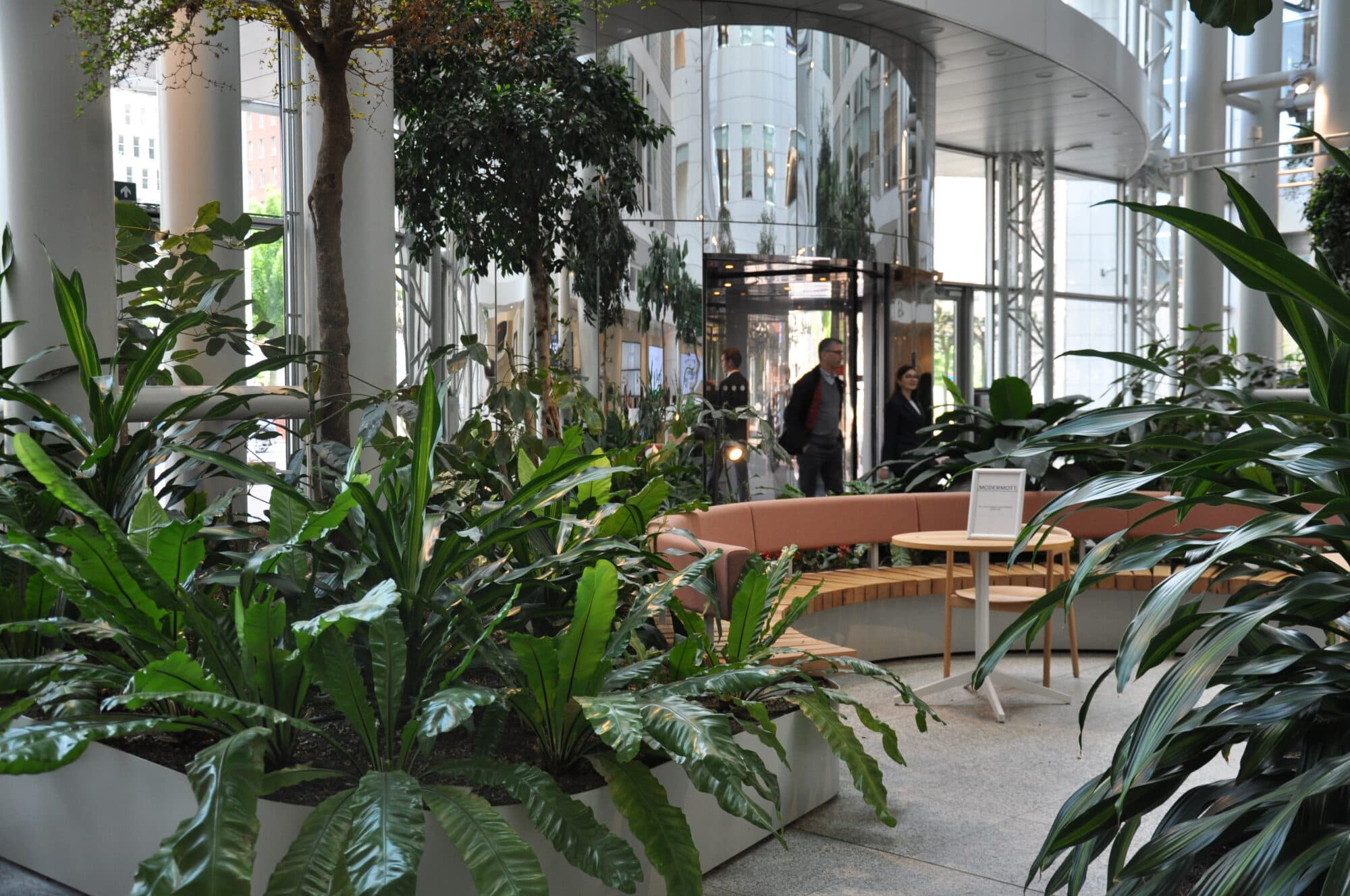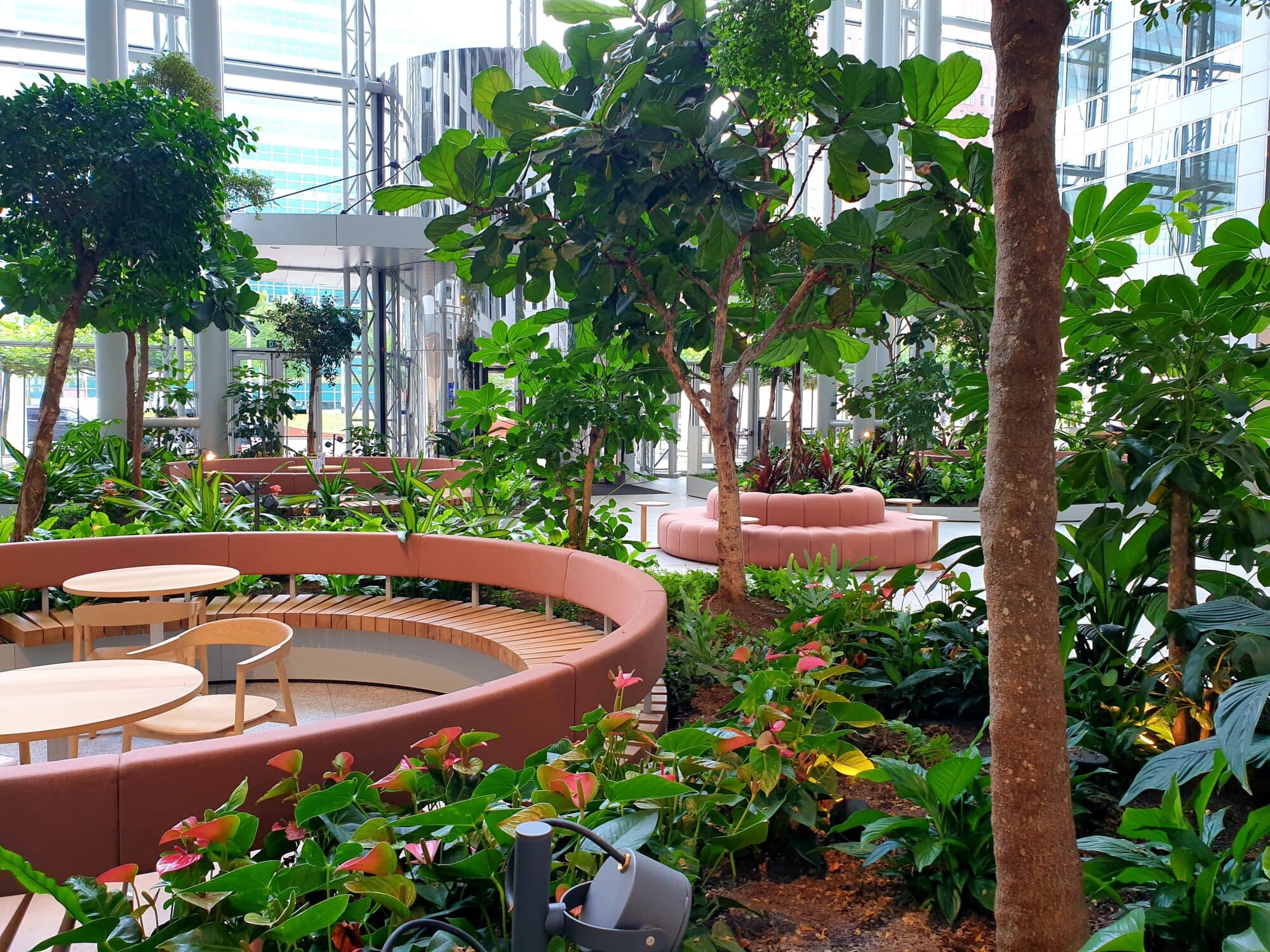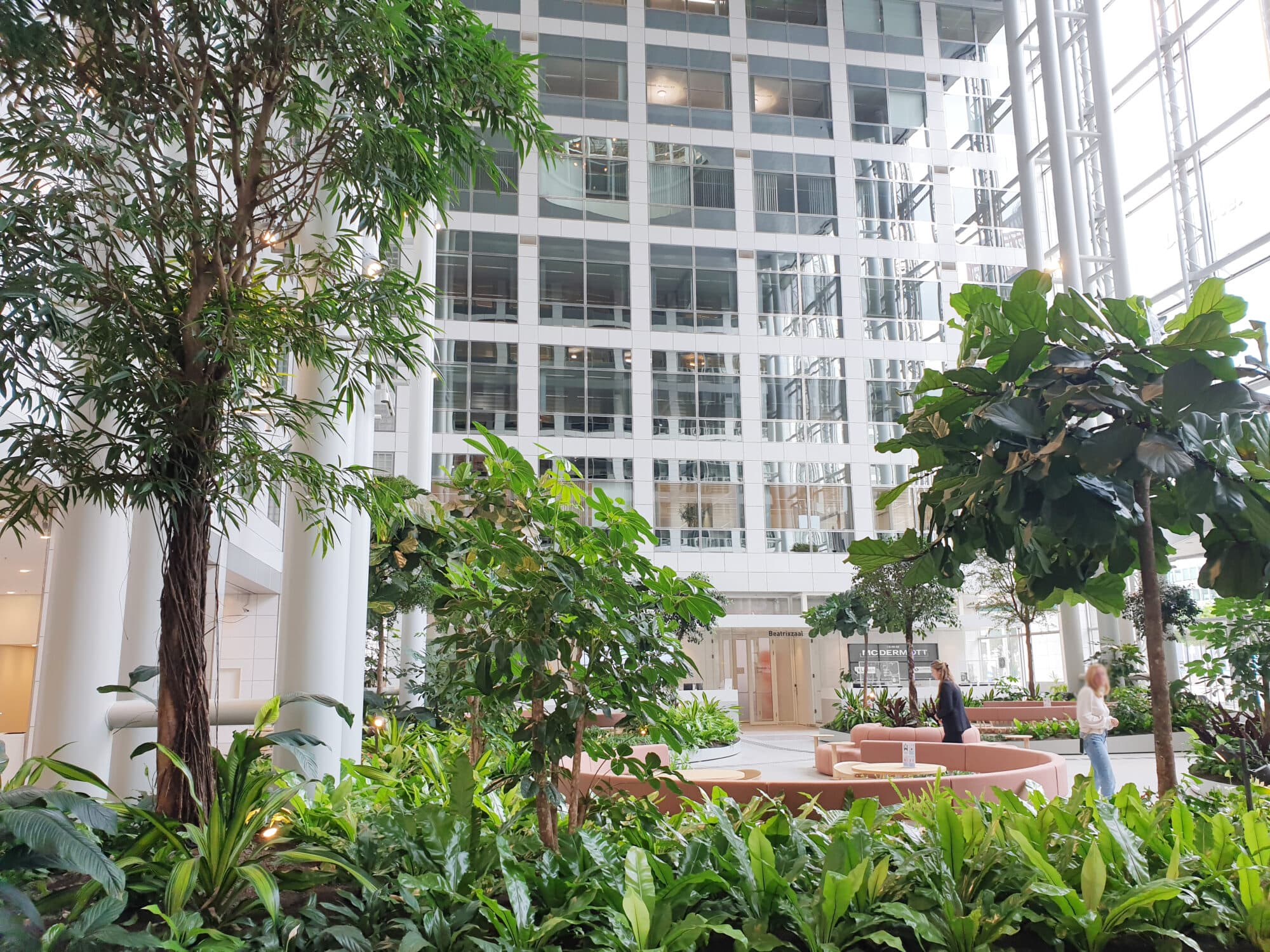 Onze visie was helder: maak van die hoge, kale entreezaal een natuurlijke oase waar mensen zich thuis voelen. Gelaagdheid vormde de sleutel tot dit ontwerp. Hoge bomen creëren volume en intimiteit, terwijl lage bodembedekkende planten organisch door de ruimte slingeren.