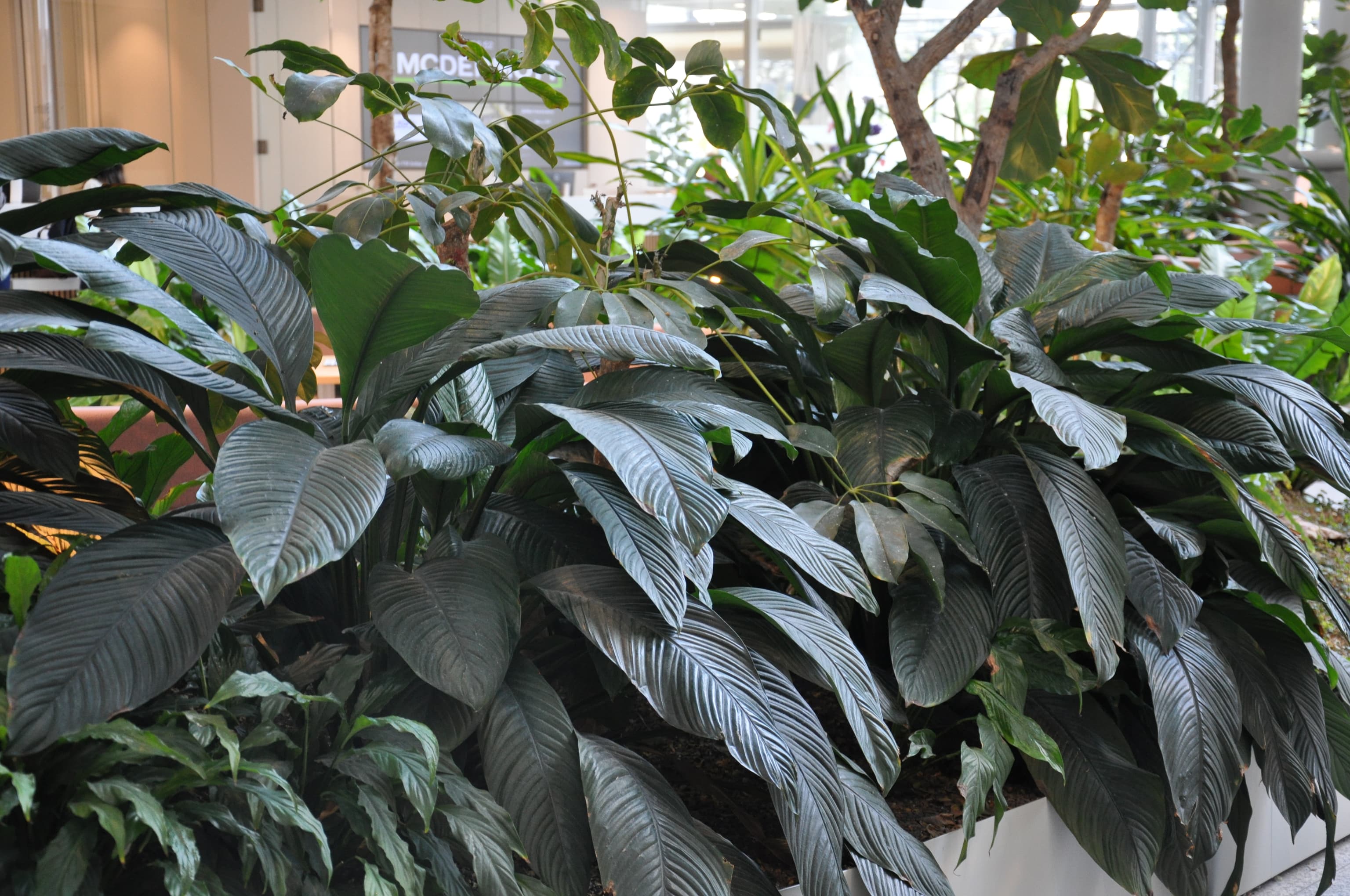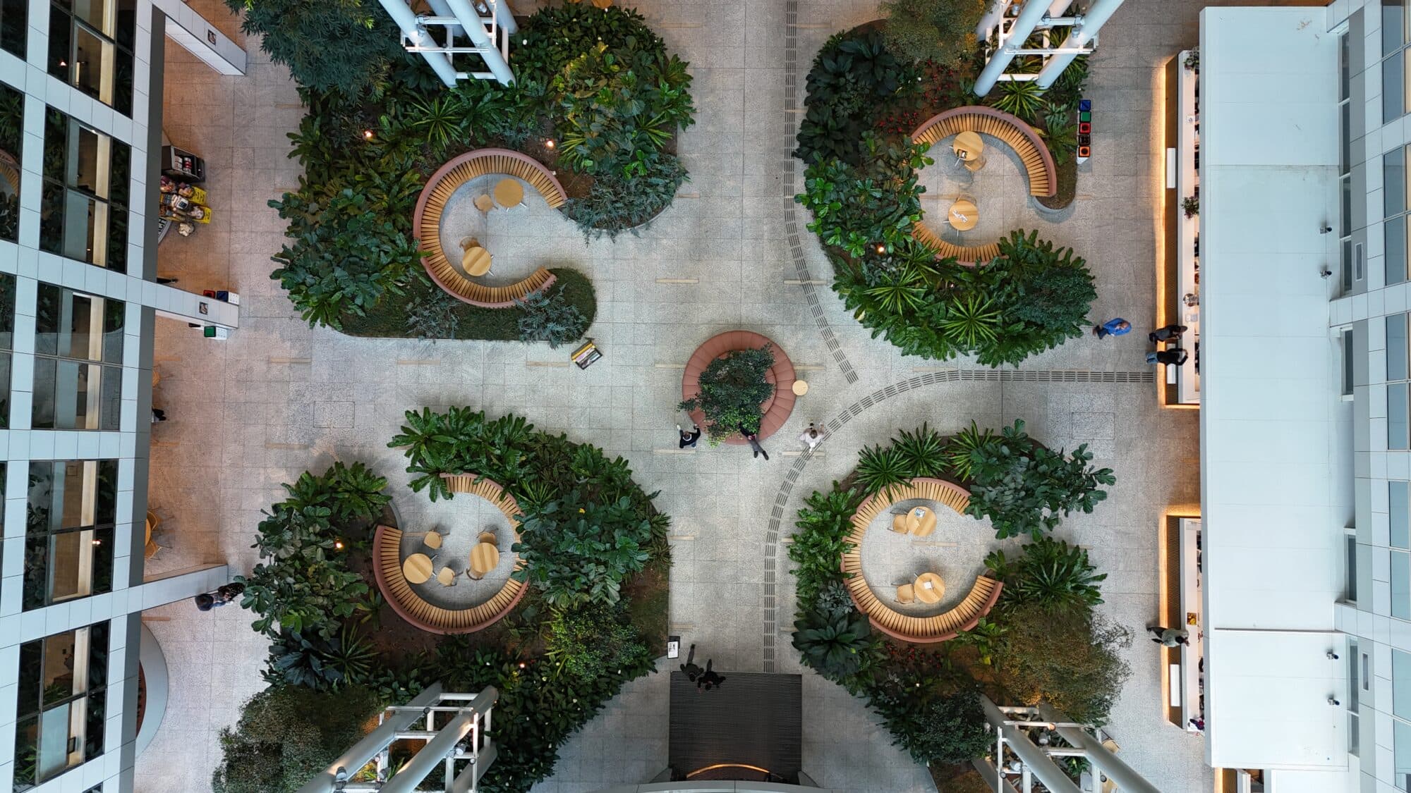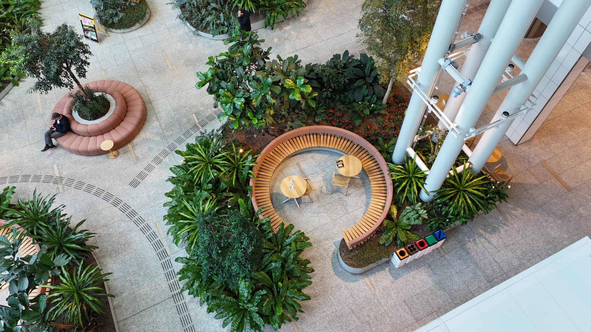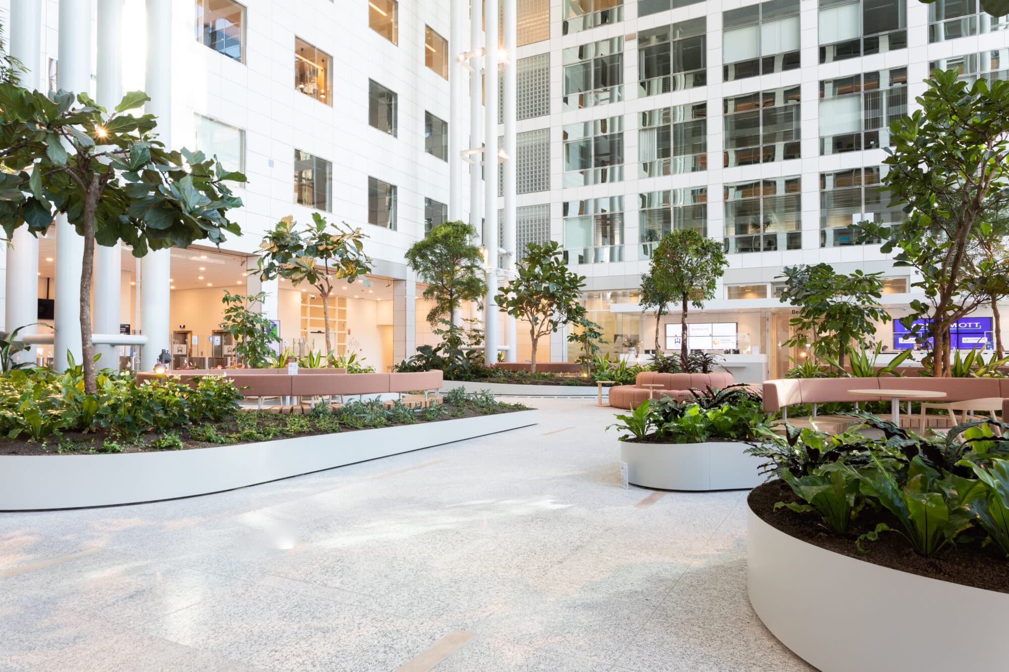 Onze visie was helder: maak van die hoge, kale entreezaal een natuurlijke oase waar mensen zich thuis voelen. Gelaagdheid vormde de sleutel tot dit ontwerp. Hoge bomen creëren volume en intimiteit, terwijl lage bodembedekkende planten organisch door de ruimte slingeren.