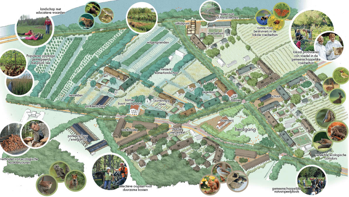 Het karakteristieke Brabantse kamerlandschap vormt de basis van ons ontwerp. Dit landschapstype, met zijn lanen, houtwallen en heggen, maken we productief voor biobased bouw. We verbouwen en oogsten hier een deel van onze bouwmaterialen. Verdeeld over drasland, velden, bosland en heide ontstaat een gevarieerd landschap dat zowel bouwmaterialen levert als de biodiversiteit verhoogt. Vijf vogelsoorten - specht, boomklever, boerenzwaluw, winterkoninkje en huismus - fungeren als graadmeter voor een gezonde leefomgeving.